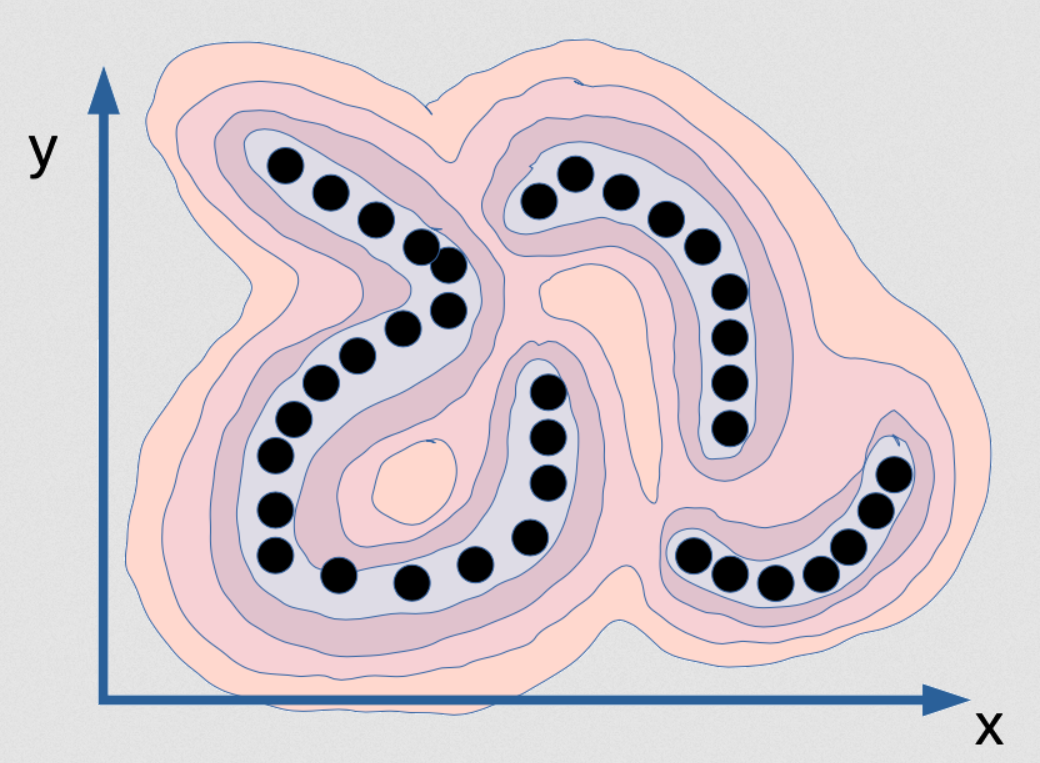 Energy-based models capture compatibility between variables using an energy function. In this example (adapted from Atcold, 2020), the energy function assigns lower values to pairs of variables \((x, y)\) that are more likely to co-occur — and higher energy elsewhere.