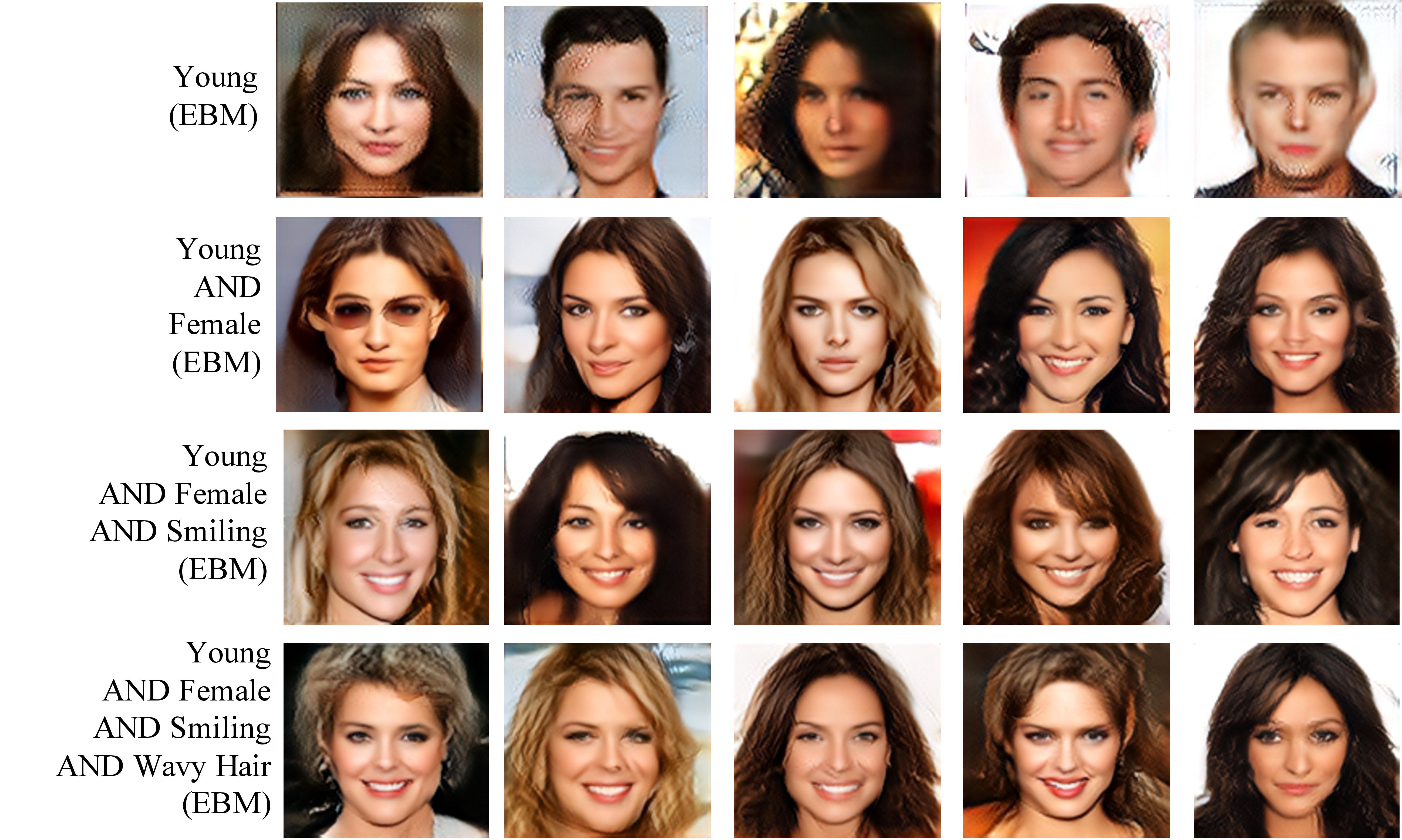In the figure below (Du et al., 2020), EBMs were used to model attributes like “young”, “female”, “smiling”, and “wavy hair”. By combining these via Product of Experts, the model generated faces that satisfied multiple specific attributes simultaneously.