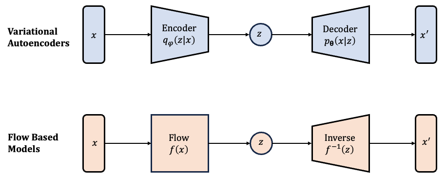 VAEs compress data into a lower-dimensional latent space using an encoder, then reconstruct it with a decoder. Flow-based models use a single invertible transformation that keeps the same dimensionality between input and latent space. This enables exact inference and likelihood computation.