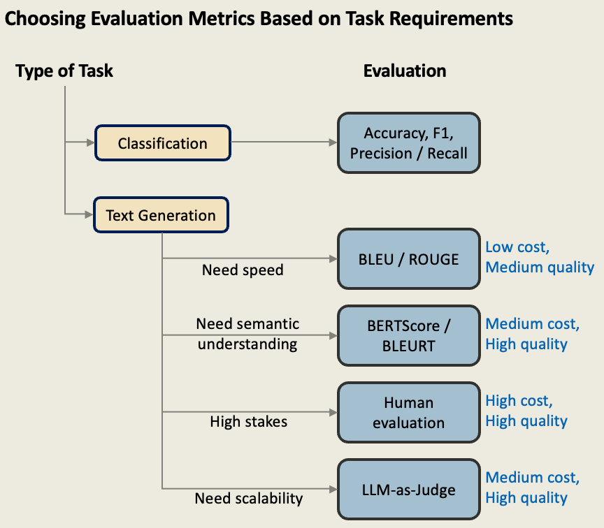 Choosing the right evaluation method depends on your specific task requirements, resource constraints, and quality needs. The following framework provides a systematic approach to selecting appropriate metrics based on these factors. While this guide offers clear starting points, remember that production systems often benefit from combining multiple evaluation approaches—using fast automated metrics for development iteration and higher-quality methods for final validation.