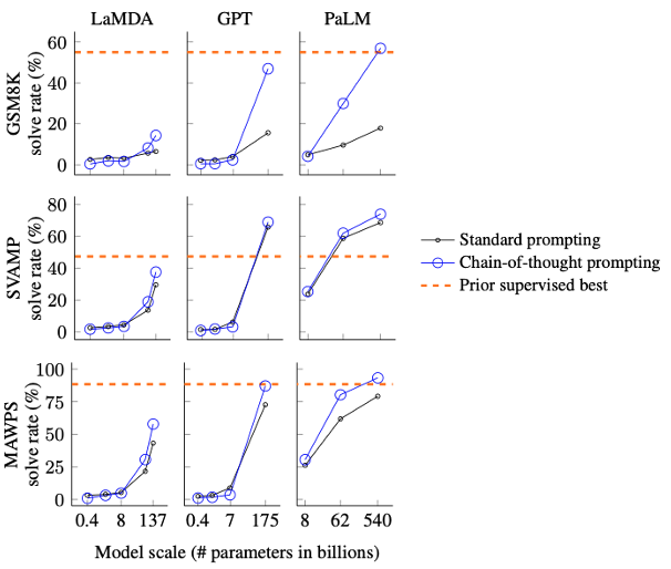 - On the GSM8K math word problem benchmark (Row 1), CoT prompting with GPT-3 175B improved solve rate from 17.7% (standard prompting) to 57.1%, a gain of nearly 40 percentage points.