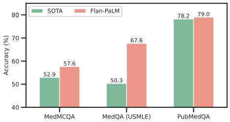 Accuracy (%) is shown for the previous state-of-the-art (SOTA) and for the domain-tuned Flan-PaLM 540B model.