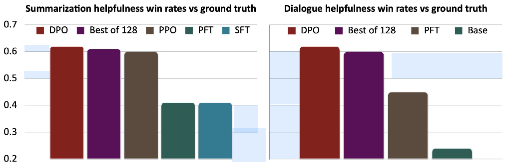 Beyond its architectural simplicity, DPO has demonstrated strong empirical performance across summarization and dialogue tasks. Figure below reports GPT-4-evaluated “helpfulness” win rates against ground truth for multiple models and baselines. DPO consistently outperforms PPO, SFT, and other methods, achieving results on par with or better than the “Best of 128” baseline across both tasks.