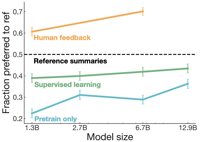 RLHF has been shown to produce higher-quality outputs than models trained only with pre-training or supervised fine-tuning. In human evaluations on the TL;DR summarization dataset, RLHF-trained models not only outperform models trained without RLHF but also exceed the quality of the human-written reference summaries—baseline summaries created by people, shown as the dotted black line in the figure below. This performance advantage is consistent across model sizes and increases steadily as model capacity grows.