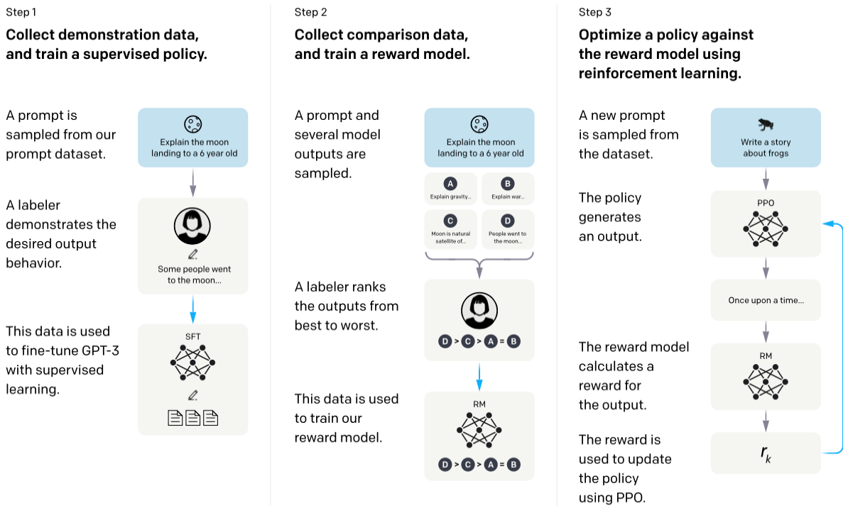 - Reinforcement Learning Optimization: Fine-tune the model with reinforcement learning (often using Proximal Policy Optimization, PPO) so that it produces outputs that maximize a learned reward model based on collected preferences.