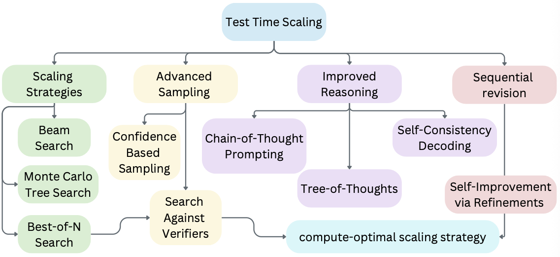 - Scaling Strategies – Methods that expand search breadth or depth, exploring multiple reasoning paths to increase accuracy (e.g., Beam Search, Monte Carlo Tree Search, Best-of-N Search).