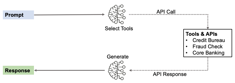 Act (Tool Use & Action) — Tool-use capabilities let the agent execute planned tasks by interacting with external systems. It might call an identity verification API, query a credit bureau database, run a calculation, update a CRM record, or send a notification. The agent chooses which tools to use based on what each step requires.