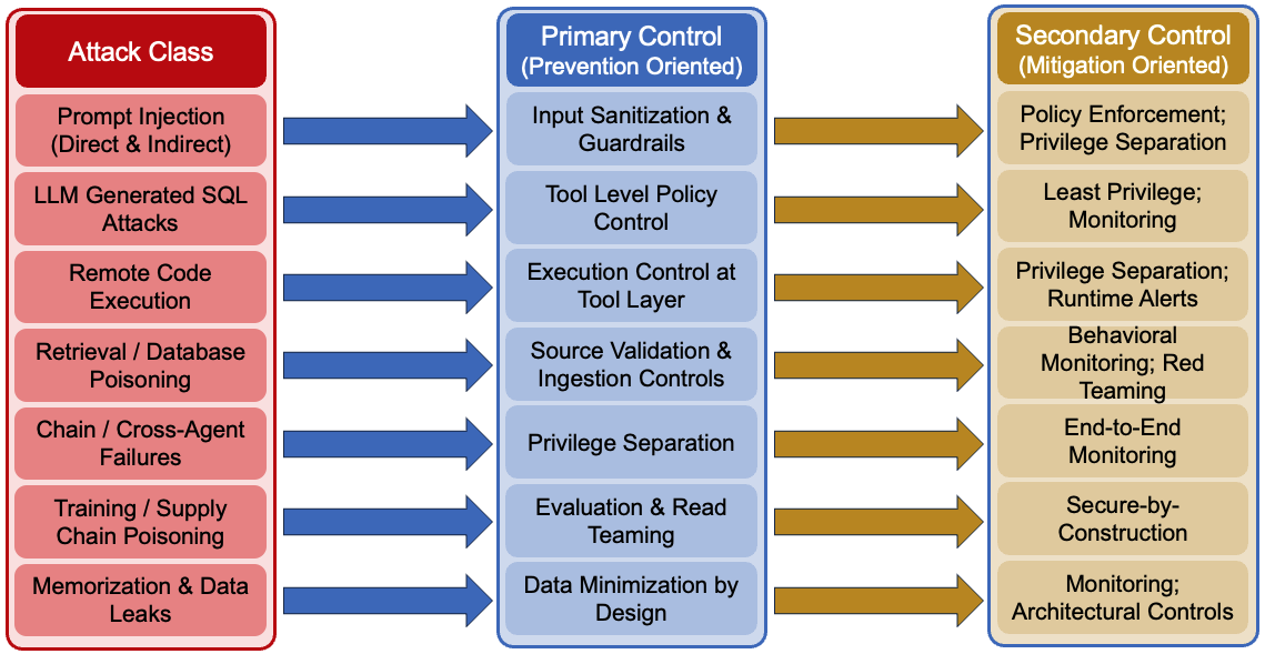 Taken together, the attack classes and defenses form a layered coverage model. The diagram below summarizes how each major agentic attack vector is addressed—and where containment, not prevention, is the primary goal.